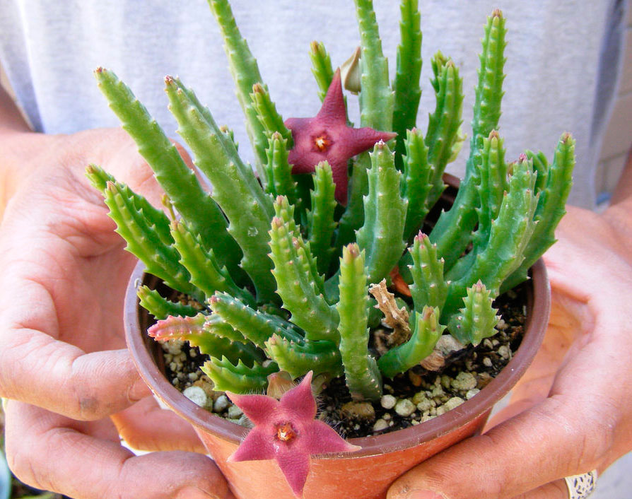 다육식물은 아파트나 사무실의 거의 모든 녹지 공간에서 찾아볼 수 있으며, 독특한 인테리어를 연출하기 위해 키우는 경우가 많습니다. 이 식물의 주요 특징은 관리가 쉽고 관리가 간편하다는 것입니다. 남아프리카 원산인 스타펠리아는 정원사들에게 인기가 많습니다. 이 다육식물은 독특하고 밝은 색의 별 모양의 꽃을 피웁니다.