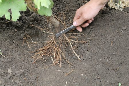 9월에 수풀의 예비 가지치기와 동시에 뿌리 가지치기(root-cutting)를 할 수 있습니다. 뿌리 가지치기는 표토층에 있는 작은 (이슬뿌리)를 제거하는 것을 포함합니다. 이 뿌리는 겨울철 토양 동결이나 건조한 여름철 건조로 인해 가장 먼저 피해를 입으며, 포도나무 진딧물에 의한 피해에 대한 저항력이 가장 약합니다. 작은 뿌리의 뿌리썩음병은 주근까지 퍼질 수 있습니다.