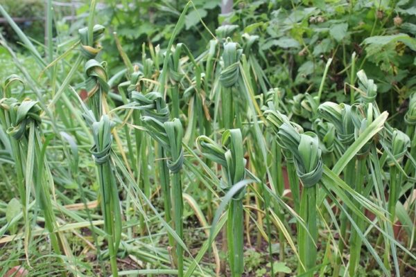 마늘의 윗부분이나 어린 줄기를 전통적으로 매듭으로 묶어 더 크고 품질이 좋은 구근을 만듭니다. 이렇게 하면 좋은 씨앗이 맺히고 수확한 작물의 유통기한이 길어집니다. 이 방법은 손상된 윗부분을 서서히 건조시켜 대부분의 영양분이 구근으로 전달되도록 하는 방식입니다.