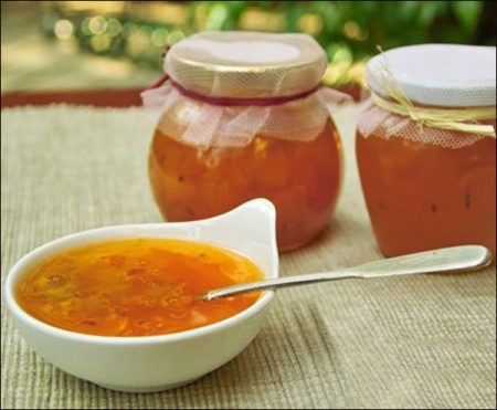 잼을 중불에서 끓을 때까지 익힙니다. 오렌지를 씻어 껍질을 포함하여 반으로 자릅니다. 오렌지를 그릇에 담고 불을 줄입니다. 30분 동안 끓인 후 불에서 내립니다. 향긋한 향이 납니다. 겨울 준비가 끝났다.
