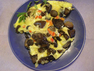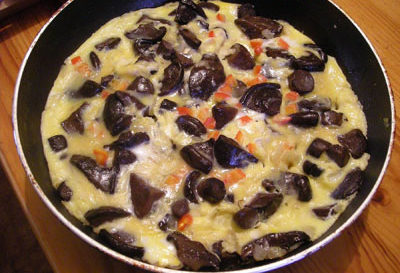 - 계란, 버섯, 양파를 팬에 붓고 뚜껑을 덮은 후 오믈렛이 완성될 때까지 약한 불로 조리합니다.