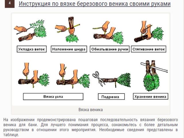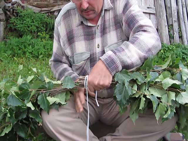 어떤 방법으로 묶든, 가지는 모두 같은 길이로 골라야 하며, 줄기 전체에 옹이와 버가 있는지 확인해야 합니다. 찜질방에서 묶을 때 찜질한 피부가 다치지 않도록 이러한 부분들을 다듬어야 합니다.