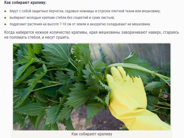 정원 가위는 가지를 자르는 데 적합합니다. 크고 빽빽한 잎을 가진 튼튼한 식물을 선택하세요. 하지만 대량으로 수확할 때는 쐐기풀이 난 지역을 깎아낸 후 집에서 가지를 분류하고 가공합니다.