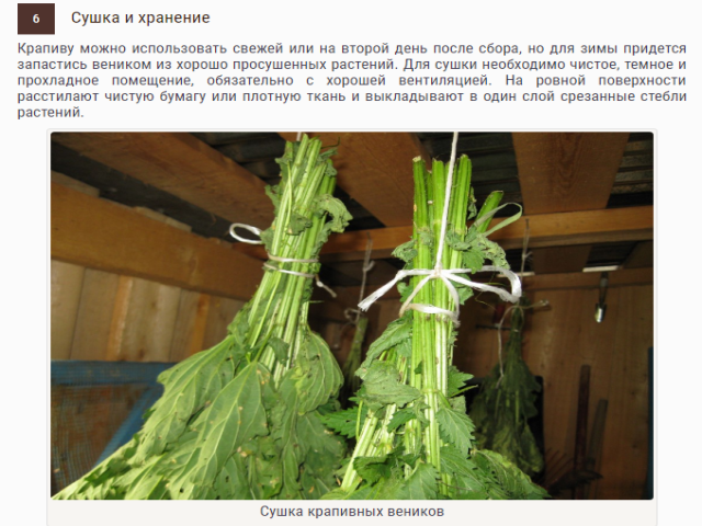 묶음을 준비하려면 땅에서 10cm 높이에서 가지를 잘라 삼베나 두꺼운 천 위에 조심스럽게 놓습니다. 비가 온 후에는 쐐기풀을 수확하지 않는 것이 좋습니다. 습기로 인해 식물 전체가 수분으로 포화되어 제대로 건조되지 않기 때문입니다. 시간이 오래 걸릴 뿐만 아니라 가지가 부서지고 약해집니다. 여름과 봄에는 목욕 직전이나 며칠 전에 묶음을 준비합니다. 어떤 경우든 쐐기풀은 햇볕이 잘 들고 건조한 날의 전반부에 수확해야 합니다.