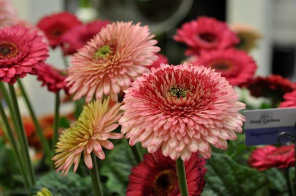 - 정원용 거베라 잡종입니다. 높이는 약 45cm, 지름은 30~40cm까지 자랍니다. 이 품종은 최대 20개의 꽃줄기를 형성합니다. 꽃봉오리는 여러 가지 색깔을 띠며, 개화 기간은 초봄부터 가을까지입니다.