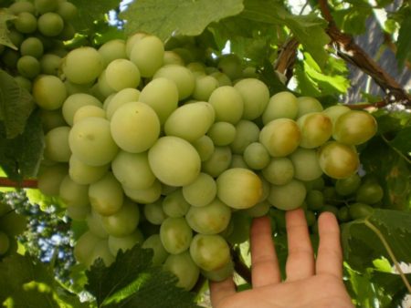 송이는 원통형-원뿔형으로 크고 무게는 800~1,300g이며, 밀도는 중간 정도입니다. 송이는 최대 35cm까지 자랄 수 있습니다. 잘 관리하면 한 송이의 무게는 최대 2kg까지 나갈 수 있습니다. 열매는 타원형이며 길이 1.5~2cm, 무게는 10~13g이고, 익으면 연녹색으로 변합니다. 껍질은 촘촘하고 바삭하며, 흰색 왁스 같은 막으로 덮여 있어 먹을 때 거의 눈에 띄지 않습니다. 과육은 육질이 풍부하고 즙이 많습니다. 은은한 머스캣 향이 나며, 이 품종의 시음 점수는 10점 만점에 8.2점입니다.