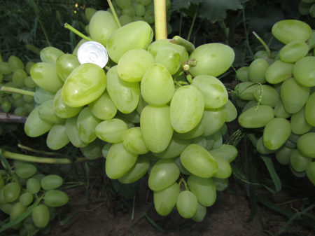 열매는 둥글고 규칙적인 모양이며, 끝부분이 약간 길쭉합니다. 열매는 녹황색을 띠며 얇은 왁스층으로 덮여 있습니다. 무게는 18~20g으로 상당히 무겁습니다. 과육은 단단하고 과즙이 풍부합니다. 당도는 높지만 산도는 약 5~6g으로 낮습니다. 열매는 빽빽하고 무거운 덩굴에 수확됩니다. 열매가 떨어지지 않고 덩굴 하나의 무게는 최대 2kg까지 나갈 수 있습니다. 모든 큰 품종이 이렇게 큰 크기를 자랑하는 것은 아닙니다. 이 포도는 다용도로 활용됩니다. 생과일 섭취, 와인 양조, 통조림에 적합합니다. 바제나 포도는 통째로 사용해도 맛있는 콩포트를 만들 수 있습니다. 통조림을 만들 때는 과일의 단맛 때문에 설탕을 너무 많이 넣지 않도록 주의하세요(1.5~2배로 줄여야 합니다).