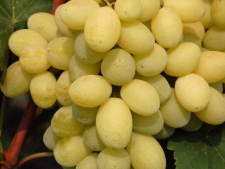 열매는 연한 녹색을 띠며, 햇빛을 가장 많이 받는 곳은 호박색입니다. 크고 타원형이며 길쭉합니다. 포도알 하나의 무게는 7~10g이고 길이는 3~4cm입니다. 뿌리줄기가 길면 더 크게 자랄 수 있습니다. 하지만 이 경우 숙성 기간이 다소 길어지고 풍미가 덜합니다. 일단 익으면 열매는 오랫동안 줄기에 단단히 붙어 있습니다. 껍질은 조밀하고 바삭하며, 왁스 같은 코팅이 얇게 입혀져 있습니다. 이 열매는 달콤하면서도 시큼한 맛이 뛰어납니다. 과실의 당도는 최대 20%이며, 산도는 리터당 6~8g입니다. 즙이 많은 과육 속에 있는 씨앗은 크고 단단합니다.