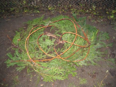 가문비나무 가지를 땅에 깔고, 그 위에 구부린 포도나무 덩굴을 올려놓습니다. 그 위에 가문비나무 가지를 더 올려놓습니다. 가지 끝은 첫서리가 내릴 때까지 그대로 둡니다. 포도나무를 습기로부터 보호하기 위해 윗부분은 부직포로 덮습니다.