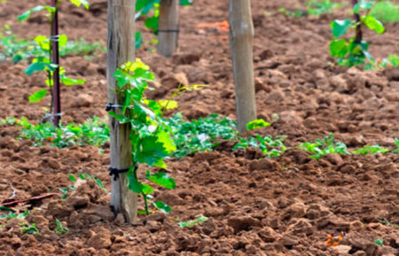 포도나무를 심은 후 지지대에 묶고, 물을 주고, 흙을 유기물로 덮습니다.