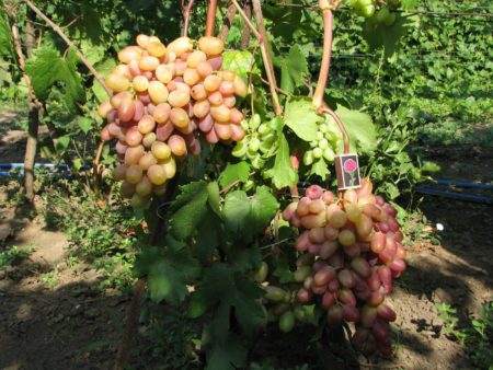 포도송이는 재배 기술에 따라 크기가 다릅니다. 한 송이의 무게는 700g이 넘을 수 있지만, 일반적으로 500g에서 650g 사이입니다. 열매는 단단하게 뭉쳐 있지만, 으깨지지는 않았습니다. 포도 자체의 무게는 15~20g이며 타원형입니다. 끝은 약간 뾰족합니다. 색깔은 분홍색에서 보라색까지 다양합니다. 색깔은 햇빛과 온도에 따라 달라집니다. 껍질은 적당히 단단하여 씹어도 거의 느껴지지 않습니다. 맛은 단맛과 신맛이 균형을 이룹니다. 과육은 단단하고 여러 개의 작은 씨앗이 들어 있습니다.