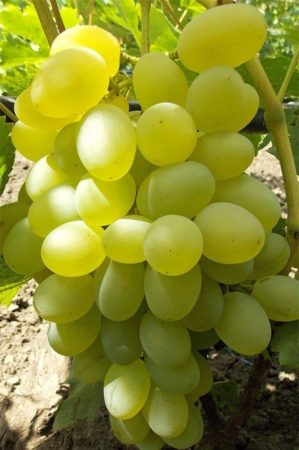 초조생 잡종으로 100일 만에 익습니다. 부모 품종: 즈베즈드니, 케샤 1, 리자마트. 가장 큰 송이는 최대 2,500g까지 나갑니다. 열매는 크고 아름다우며, 다육질이고 녹황색에 호박색을 띱니다. 모양은 장타원형으로 길이 3cm, 지름 2.8cm입니다. 풍미는 풍부하고, 배와 머스캣 향이 은은하게 납니다.