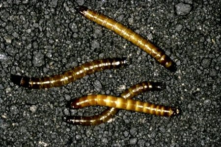 - 암흑딱정벌레의 유충입니다. 키틴질 껍질은 짙은 노란색이며, 길이는 약 2.5cm입니다.