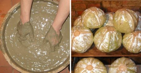 붉은 점토를 물에 희석하여 사워크림 정도의 농도로 만듭니다. 양배추를 이 혼합물에 담그고, 그 결과 나온 점토 덩어리를 햇볕에 말려 겉면이 굳은 후 지하 저장고에 보관합니다.