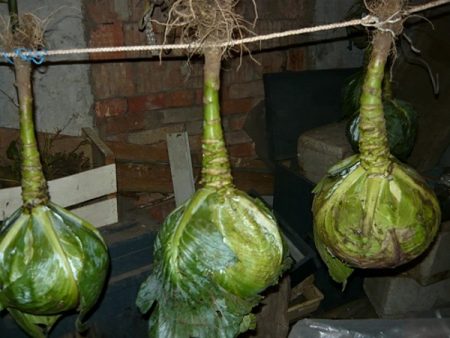 양배추는 긴 줄기를 그대로 파냅니다. 지하실 천장에 갈고리를 나사로 고정하고, 줄기에 밧줄을 달아 포크를 걸어 놓습니다. 이 방법은 양배추를 잘 보관할 수 있지만, 걸어둘 공간이 많이 필요합니다.