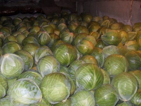 양배추는 건조하고 햇볕이 잘 드는 중추에 캐냅니다. 캐낸 후 뿌리를 잘라내고 겉잎을 제거합니다. 캐낸 채소는 캐노피 아래에 1~2일 동안 두어 말립니다. 작고 덜 익은 양배추는 나중에 사용하기 위해 따로 보관합니다. 속이 비어 있거나, 동상에 걸렸거나, 해충이나 질병에 심하게 감염된 양배추는 보관하지 않습니다.