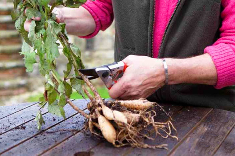 지금 새싹을 제거해야 합니다3cm 길이로 남겨두고 뿌리에 남은 흙을 제거합니다. 덩이줄기는 서늘하고 건조한 곳에 옮겨 말려야 합니다. 최적의 건조 온도는 14~16°C입니다.영형이 상태는 약 2~3주 동안 유지됩니다. 이 기간 동안 땅 위로 올라오는 부분은 말라 버립니다. 덤불은 면 천 위에 펼쳐 놓아야 합니다.