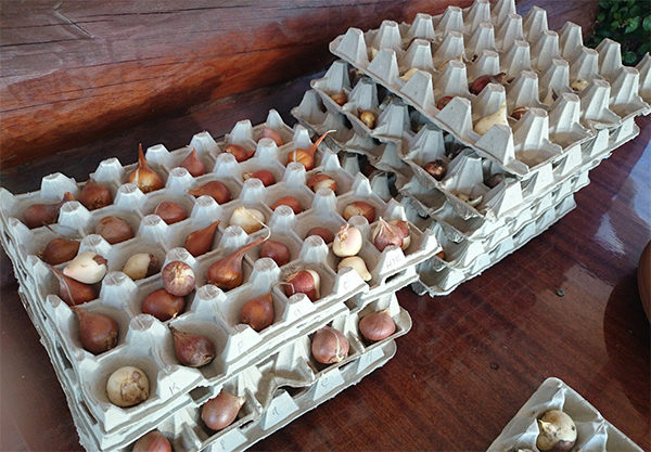 구근 식물은 겨울에도 지하실이나 서늘한 식료품 저장실에 보관합니다. 이를 위해 측면과 바닥이 격자로 된 나무 상자를 준비하고 구근을 층층이 쌓아 놓고 톱밥을 곁들여 보관합니다.