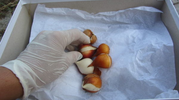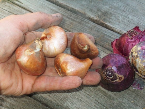 구근을 제거한 후, "성충"과 "유충"을 조심스럽게 분류합니다. 그런 다음 상자에 넣어 며칠 동안 말린 후 다시 검사합니다.