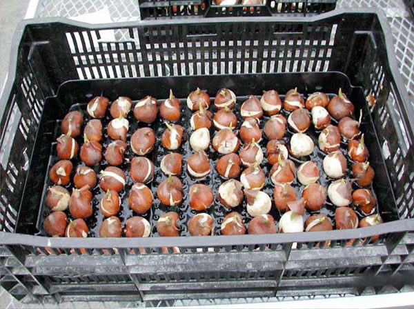 미리 쪄서 만든 정원 흙에 토탄과 강모래를 섞은 것이 토양으로 적합합니다. 모래 대신 질석을 첨가할 수 있습니다. 흙을 상자에 붓고 구근을 조심스럽게 심습니다. 이 상태는 봄까지 유지되며, 봄이 되면 뿌리는 내리지만 자라지는 않습니다.