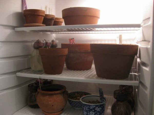 소량의 심기 재료는 냉장고 아랫칸에 보관합니다. 하지만 냉장고 문을 계속 열었다 닫았다 하기 때문에 봄까지 냉장고 안의 온도를 일정하게 유지하는 것은 어렵습니다.