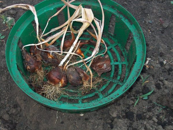 튤립 개화 시기에 맞춰 작업합니다. 4월에 개화가 멈춘 튤립은 일찍 캐내고, 5월에 꽃이 핀 구근은 나중에 처리합니다. 맑고 건조한 날을 골라 쇠스랑으로 덩이줄기를 조심스럽게 흙에서 제거합니다.