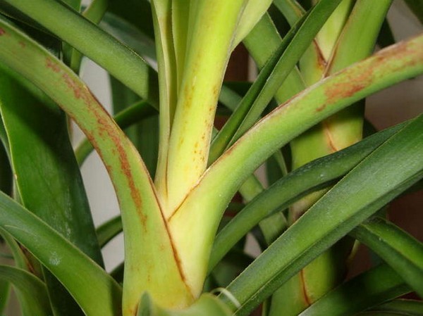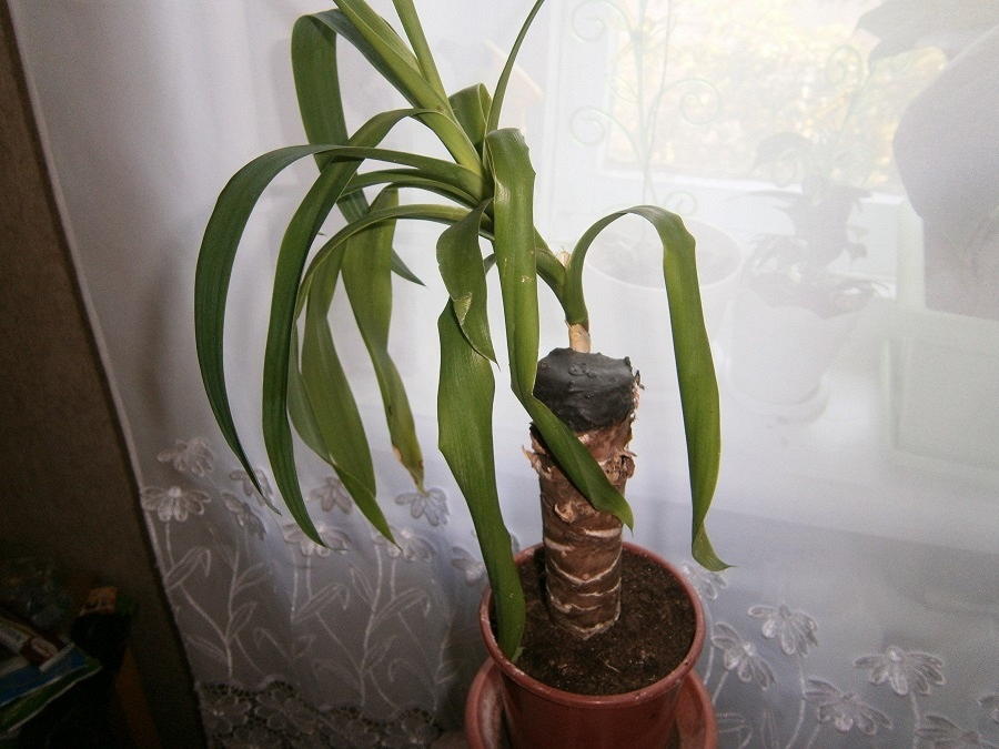 물을 너무 많이 주면 뿌리가 썩습니다. 병든 식물은 약해지고 잎이 떨어지기 시작합니다. 이 경우 물 주는 양을 줄이고, 손상된 유카 식물을 흙에서 제거하고 썩은 뿌리도 제거합니다. 그런 다음 새 흙에 다시 심습니다.