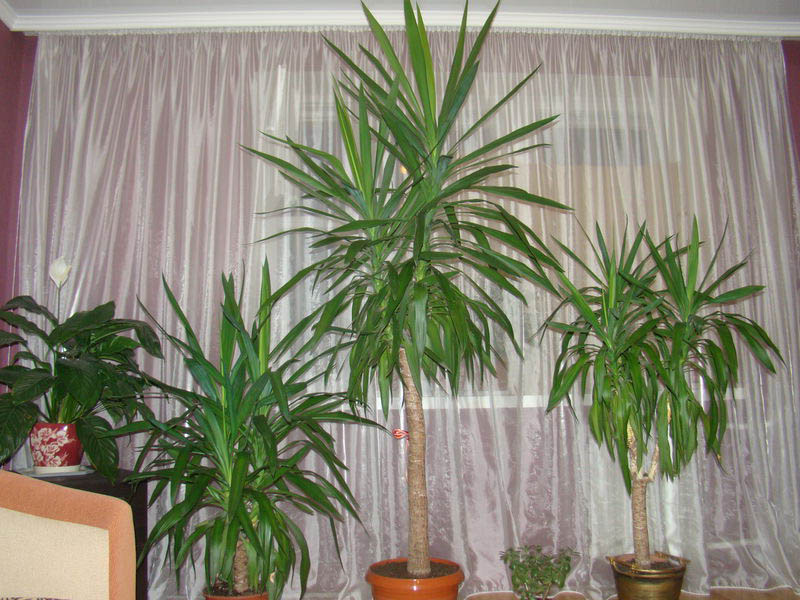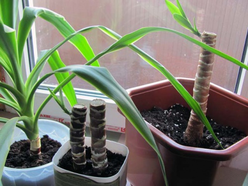 유카 꺾꽂이 - 모래에 줄기를 뿌리내리기 전에, 꺾꽂이한 부분을 물과 성장 촉진제를 섞은 용액에 2~3일 동안 담가둡니다. 그 후, 줄기를 5cm 깊이로 촉촉한 흙에 수평으로 심습니다. 식물이 자라는 동안 흙은 촉촉하게 유지됩니다. 첫 잎이 나오면 물을 줄입니다. 각 꺾꽂이가 뿌리와 잎을 내고 1~2개월 후에 나오면 개별 화분에 심기 시작할 수 있습니다.