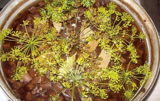 모든 재료를 잘 섞습니다. 불린 버섯은 체에 밭쳐 물기를 빼고 다시 헹굽니다. 양념장을 붓고 10분간 끓입니다. 다진 마늘과 다진 딜 줄기를 넣고 잘 섞습니다. 절인 버섯은 이제 먹을 준비가 되었습니다.