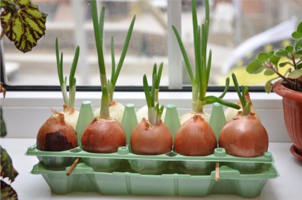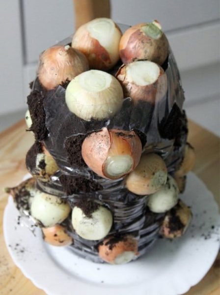 또 다른 심기 방법 – 톱밥에. 먼저 톱밥에 끓는 물을 붓습니다. 용기, 상자 또는 크레이트에 비닐을 깔고 톱밥을 10~12cm 정도 깔고 양파를 심습니다. 물을 줍니다. 톱밥의 장점은 수분을 오랫동안 유지한다는 것입니다.