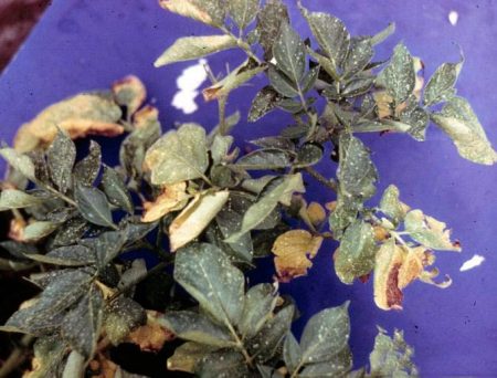잎이 노랗게 변하고 중륵 주위가 말리는 것도 흑각병의 징후일 수 있습니다. 그러나 이 병의 주요 증상은 괴경에서만 나타납니다. 괴경이 검게 변하고 썩기 시작합니다. 뿌리와 줄기 아랫부분도 검게 변하고 썩기 시작합니다. 병든 나무는 파내어 불에 태우고, 병든 나무가 자란 부위는 보르도액이나 재와 황산구리를 섞은 용액(재 1리터에 황산구리 1큰술)으로 처리해야 합니다.