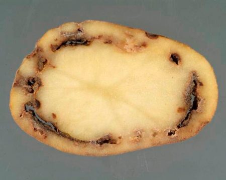 감자 식물의 얇은 줄기와 잎이 노랗게 변하기 시작합니다. 시간이 지남에 따라 말라 죽습니다. 진단을 확인하려면 감염된 식물의 덩이줄기를 파내어 잘라 보세요. 껍질 근처에 갈색이나 노란색 고리가 과일을 둘러싸고 있습니다. 증상이 심해지면 과일이 썩고, 누르면 점액이 분비됩니다. 병든 식물은 모두 제거하고, 남은 식물에는 칼륨과 질소 비료를 시비해야 합니다.