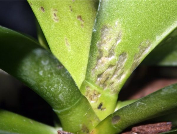 감염된 잎은 잘라내지 마십시오. 박테리아나 기타 질병이 있는 경우, 감염된 잎 부분만 제거해야 합니다. 그렇지 않은 경우 잎을 만져서는 안 됩니다. 난초는 감염된 잎에서 영양분을 공급받으며, 나중에 저절로 말라 죽습니다. 이 과정을 방해하는 것은 권장하지 않습니다.